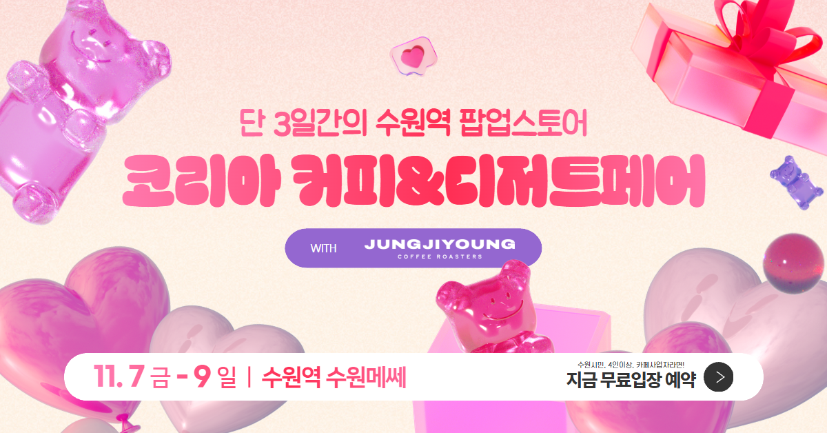 A. 커피와 디저트에 진심인 사람들, [코리아 커피&디저트페어]는 놓칠 수 없겠죠? 아주 맛있고 달콤한 세계가 여러분을 기다리고 있습니다. - 일정: 11월 7일(금) ~ 9일(일) - 장소: 수원메쎄(수원역 2